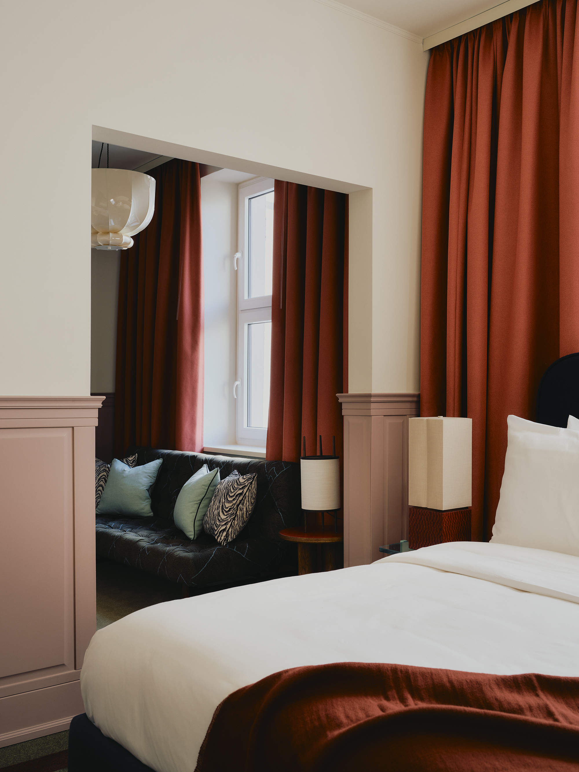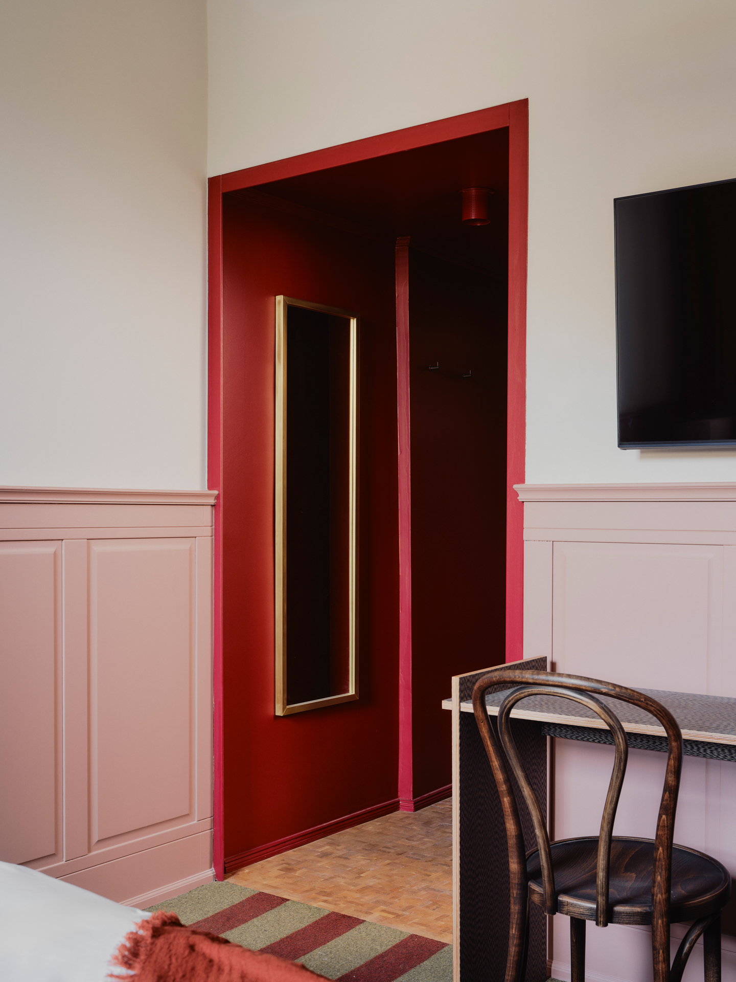“When we first went to Berlin and walked around the neighbourhood, one thing that really struck us was the contrast between colours in the buildings. We loved this as a concept, so one of our design pillars for the project became chromatic contrast, where you see colours that maybe shouldn’t work, but then you bring them together in the right balance and they end up looking and feeling so great. You can see this really clearly in the rooms, for example the entrance lobby of each room is painted a beautiful deep colour on the walls and ceiling, so when you walk in you feel a gorgeous welcoming effect as soon as you open the door. It should feel cocooning, like being hugged.”