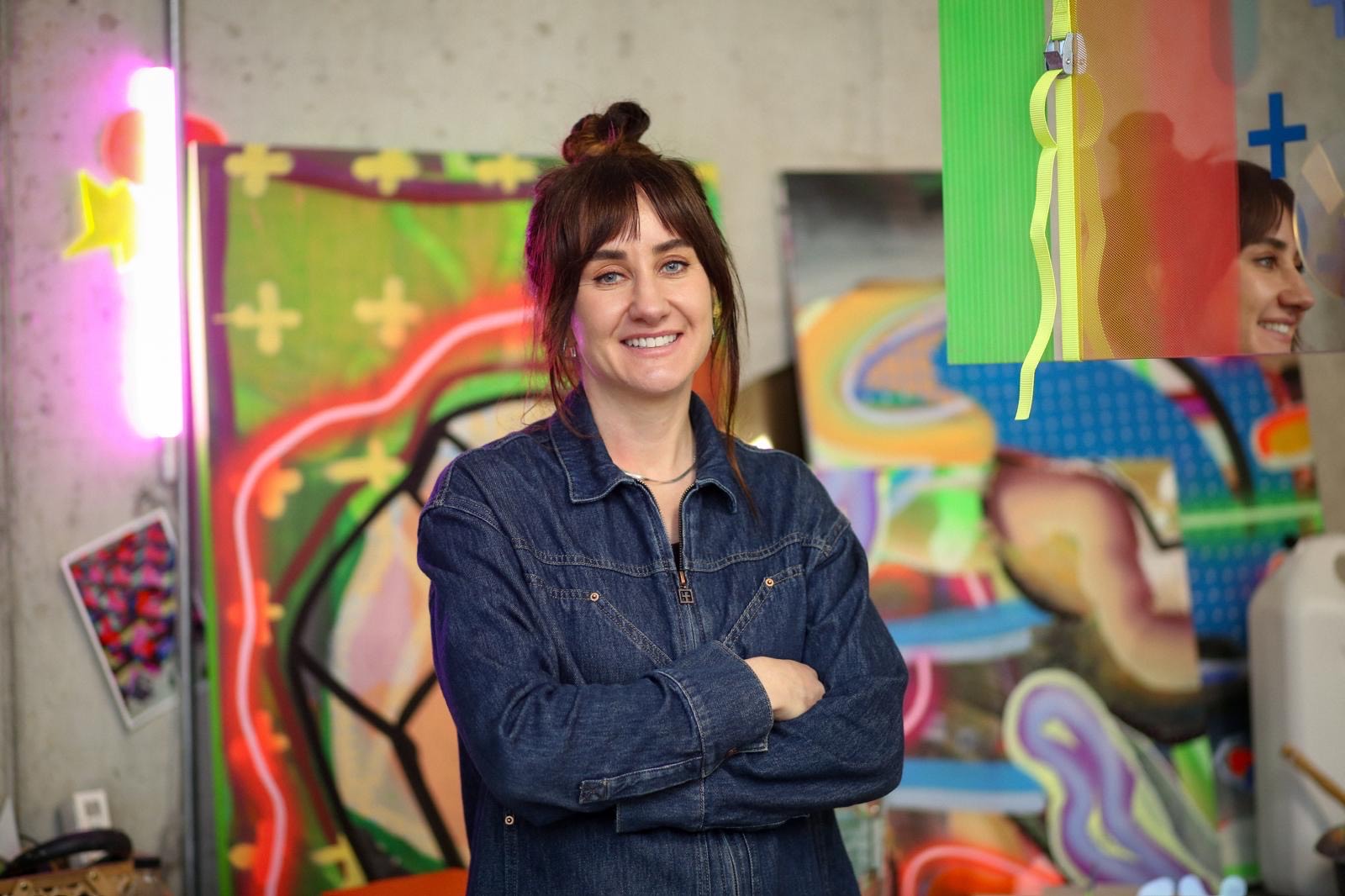 Her paintings are known for their street-art influenced, trompe l’oeil style neon tube effect. “I’ve always loved optical art. I did my thesis on the importance of visual perception and how the eye is tricked, so there’s this little skip of something. It makes you question reality. I think that’s where this luminosity, faking the idea of light in a painting, comes from.” Her interest now is in the subconscious. She paints while listening to music – previously “bangin’ techno”, more recently jazz – and has multiple paintings on the go at any one time. “I hear artists talk about how fearful they are of the white canvas but part of my process is to be defiant against that and just go for it and trust that whatever’s going down is the right thing. The work is really layered. There have been paintings that haven’t resonated with people that I’ve gone completely over again. I’m never too precious about them existing if the world doesn’t want them to exist. I’m like, well, let’s give it a new life.” Her painting practice is “impulsive and intuitive”. “There’s always one I call the humbling painting. That’s the one that isn’t working and it’s the one that really keeps you on your toes.”