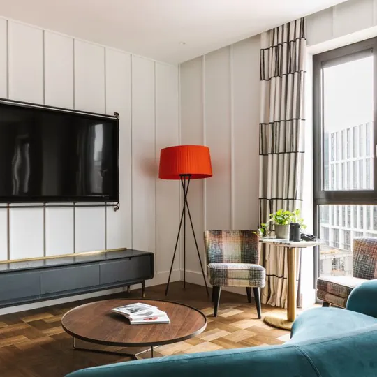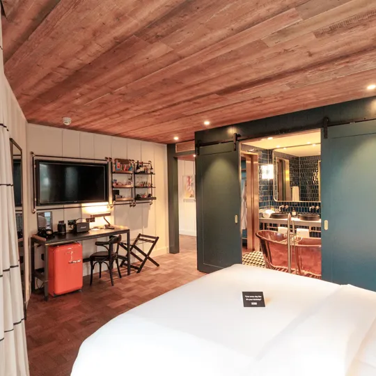 A sprawling 120-sqm suite with two bedrooms and two bathrooms with freestanding copper bathtub. After exploring the city, mix drinks at your private bar or challenge your friends to some foosball. Sleeps four.