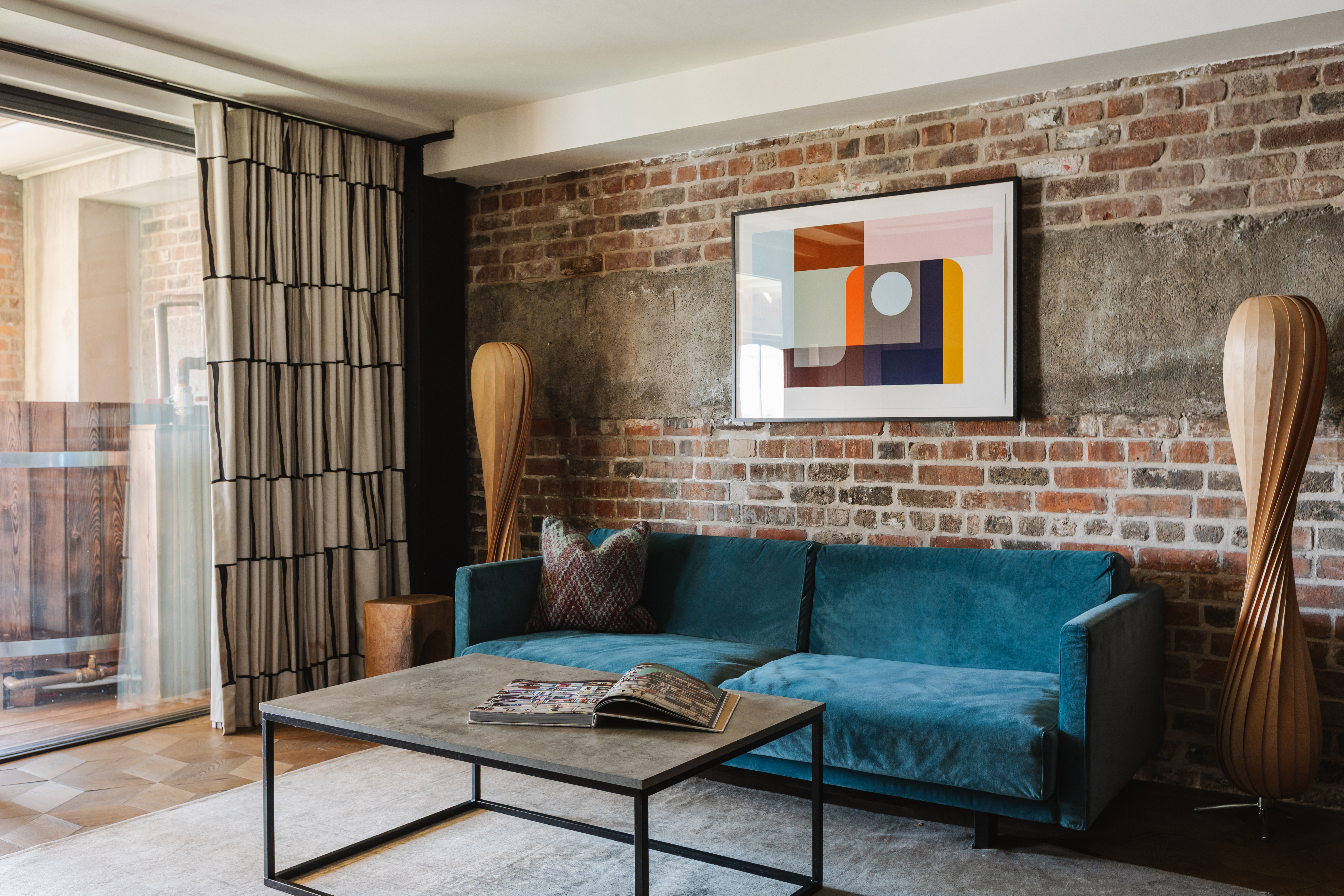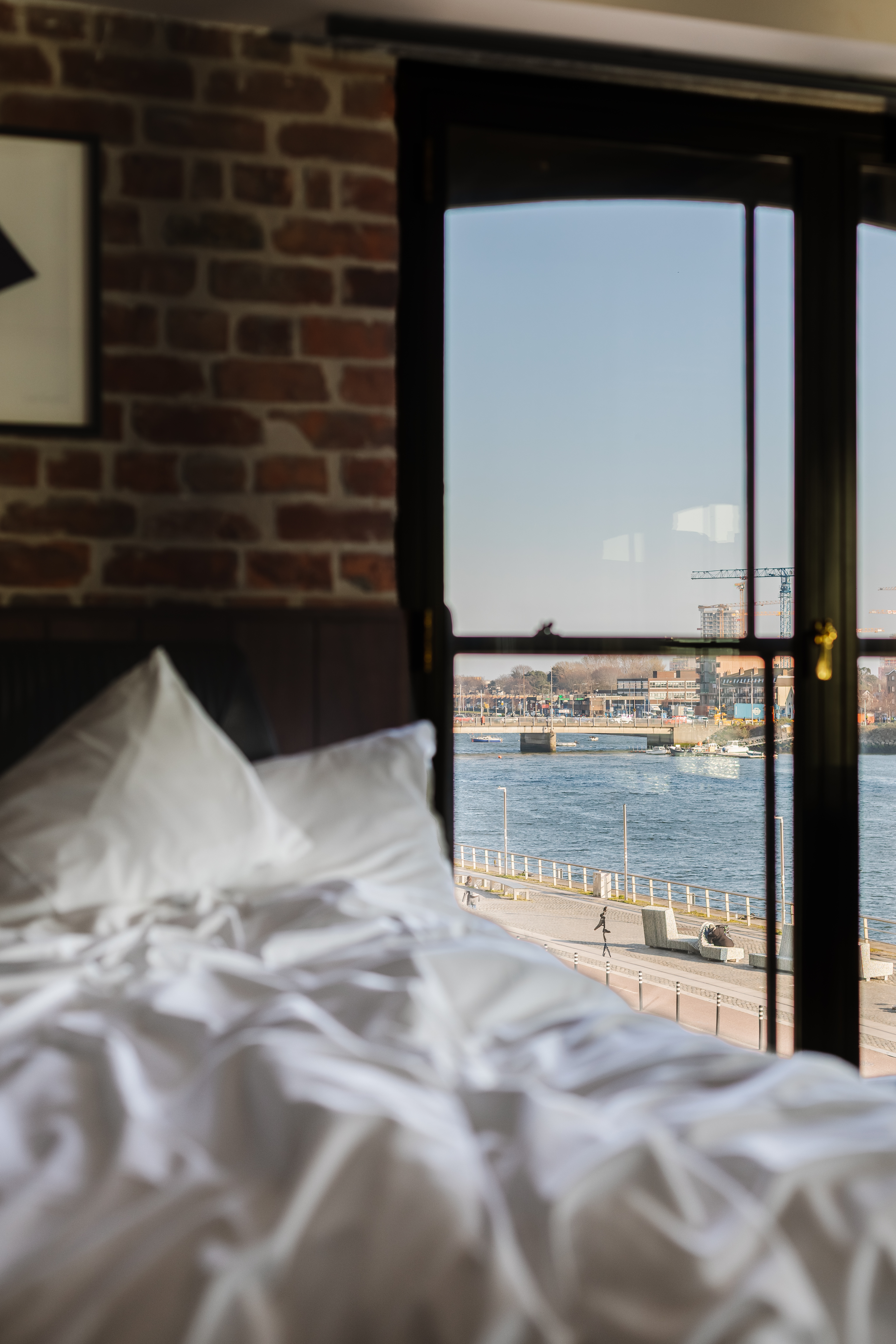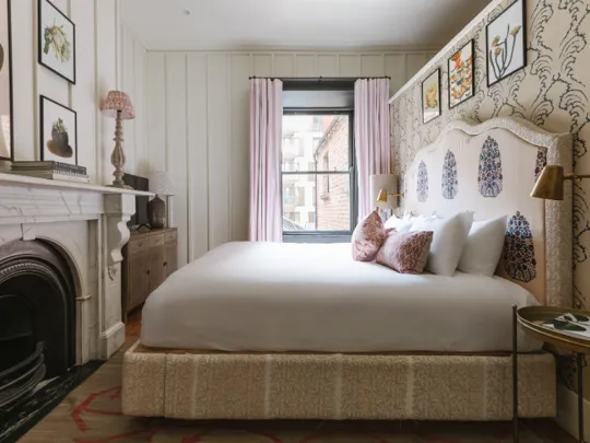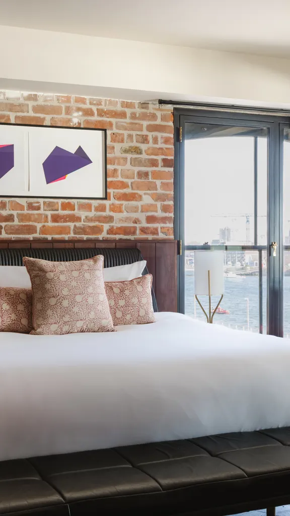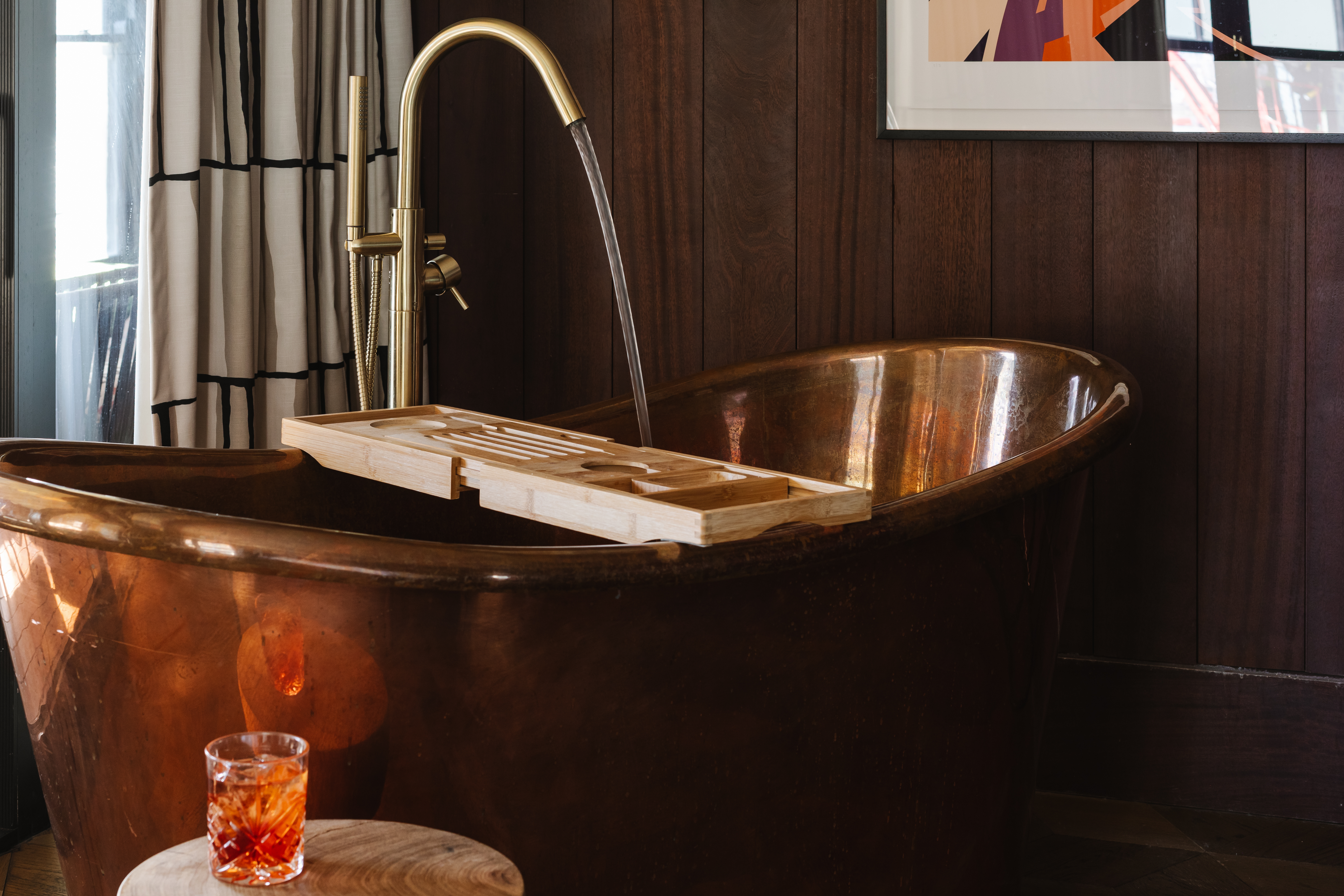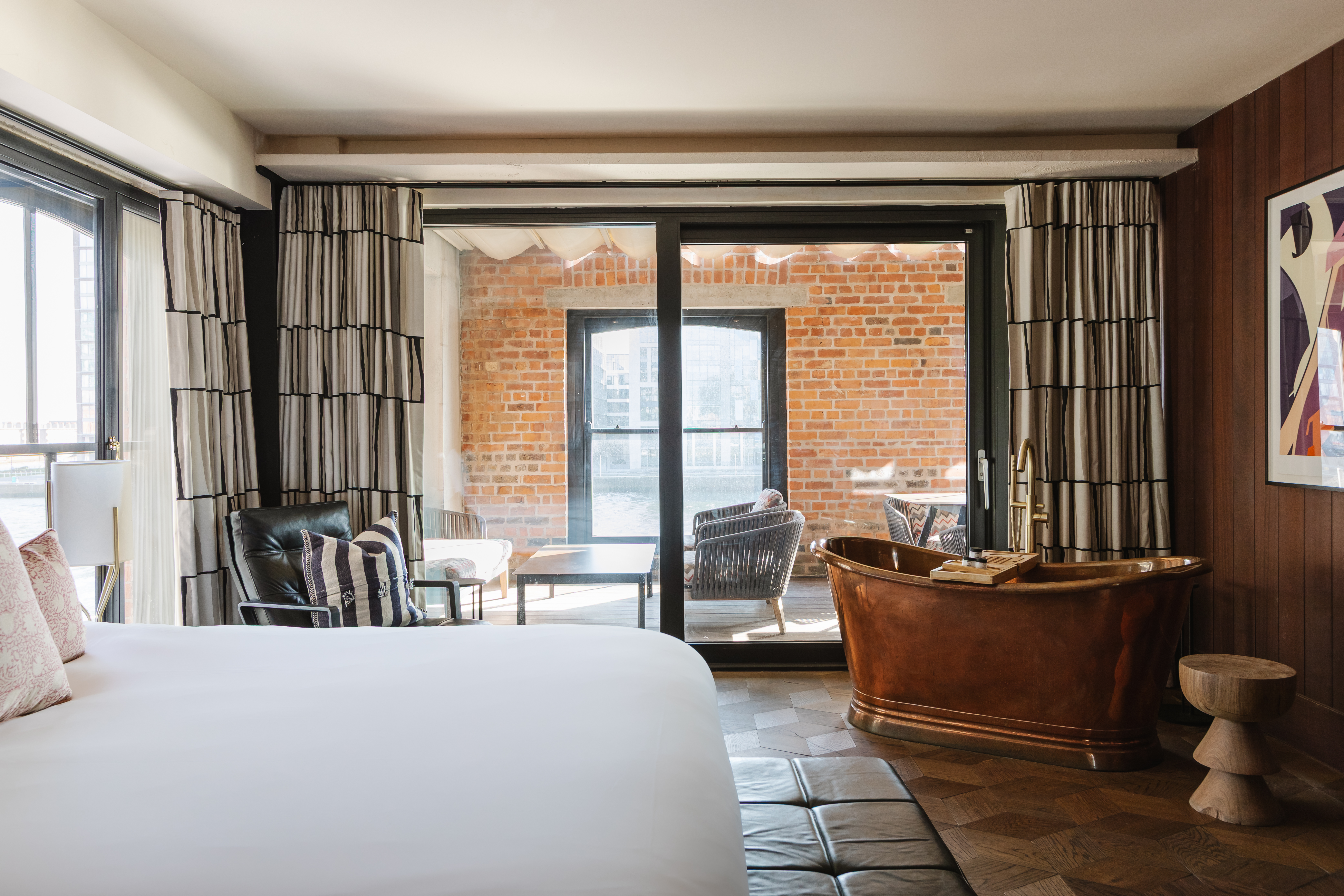 Take a dip. This rooftop retreat has a hot tub overlooking the river, a rolltop copper bathtub, and a large private outdoor terrace for lounging and dining. Brick, brass, and unbeatable views. Sleeps two.