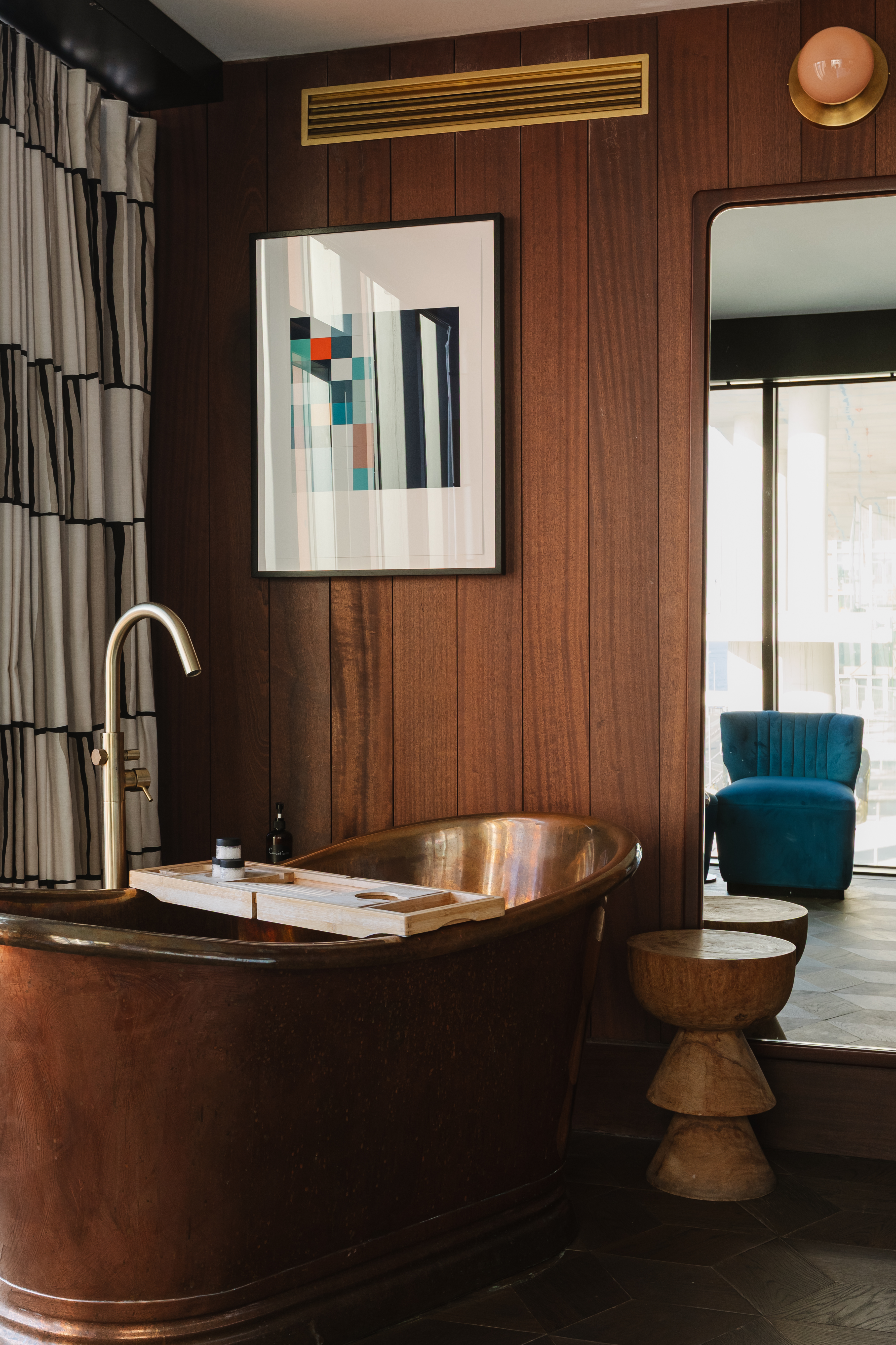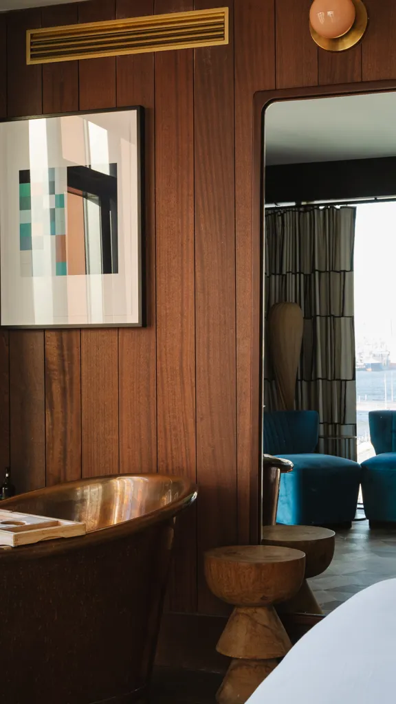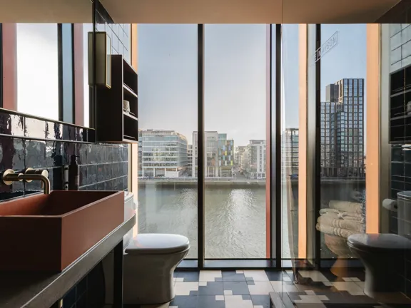 In warehouse side. Has separate living room area and a copper bath. Bedrooms on the first two floors are a warehouse-inspired look with exposed brick and large windows, while the third, fourth and fifth floors are set within a steel beam framework and feature large glass facades, flooding the rooms with natural light. The corten steel frame compliments and celebrates the industrial heritage and architectural character of the Docklands, while the glass facade floods the building with light.