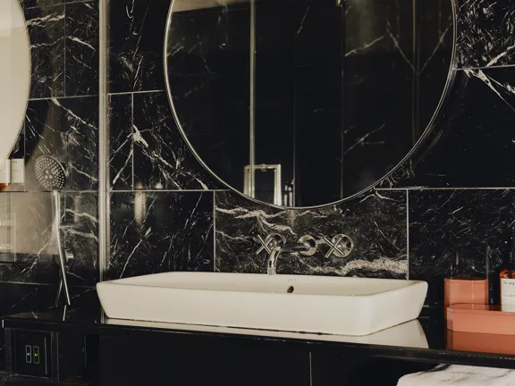 Big on space, style and character. This is our 73-sqm suite with a king-size bed, separate living room, marble bathroom, free-standing bathtub, walk-in rain shower, and separate half bathroom. Sleeps three.